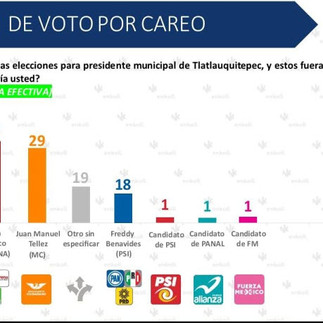 *La Encuestadora Enkoll, informa que el estudio de opinión realizado en mil 200 viviendas en 20 secciones electorales, respecto a las elecciones para presidente municipal de Tlatlauquitepec, en la intención del voto por persona, la contadora Edith Nolasco superó con 4 puntos a Juan Manuel Téllez, que se ubicó en el segundo lugar al registrar 29 puntos a favor. Y dice que la tercera posición, muy distante de los punteros, la tiene Freddy Benavidez, que en la suma logró 18 puntos porcentuales.